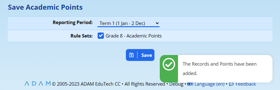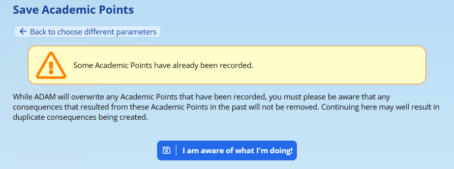 If you attempt to add a set of Academic Points twice, ADAM will warn you first: