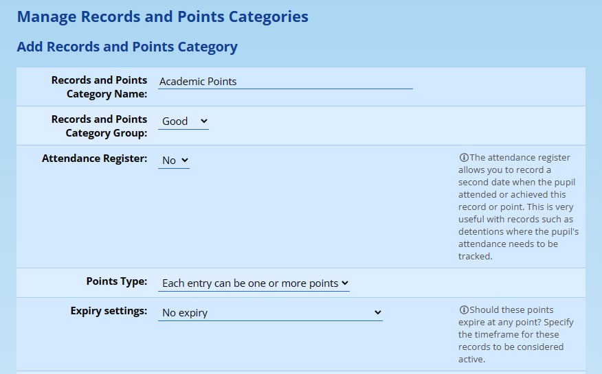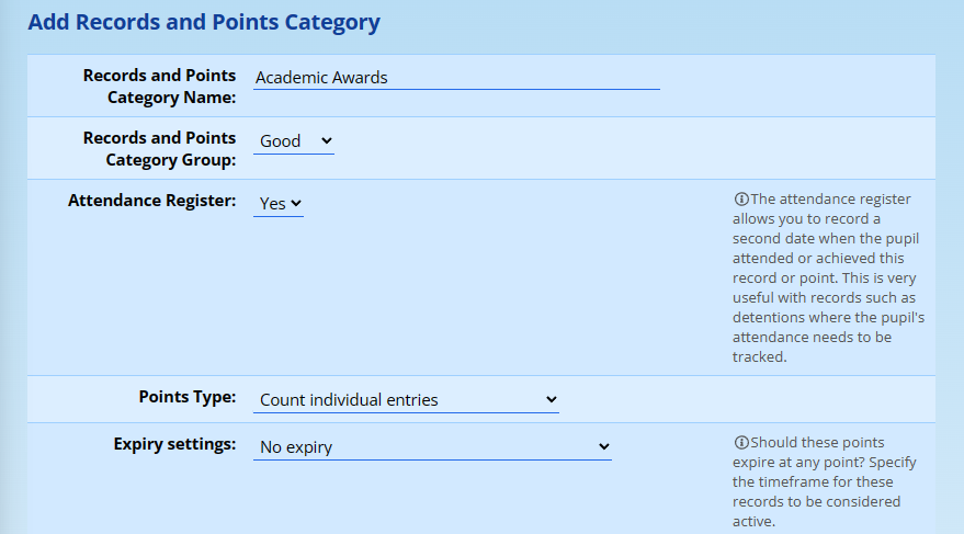 Two aspects to consider here: firstly, that the Points Type should be “one or more points”. If you leave this set to the default option, which is “count individual entries”, then the Academic Points will not be of much use - only the number of times a pupil has been awarded points will essentially be recorded - and that defeats the purpose of this module.