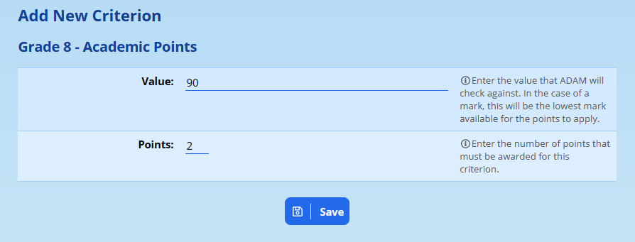 In this example, we are asking ADAM to award any result of 90% or over with 2 points. If a person got 89%, they would not get these 2 points. Note that ADAM will always round the results to the nearest percentage (using normal mathematical rounding practices) and so a person who scored 89.6% would also get 2 points with this criterion in place.