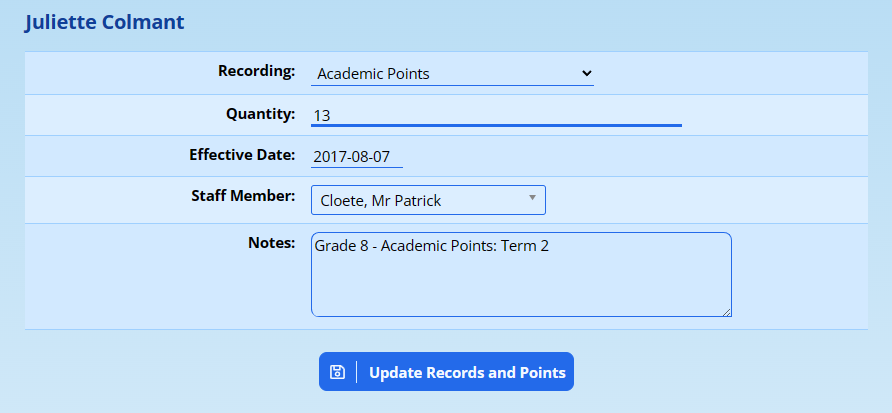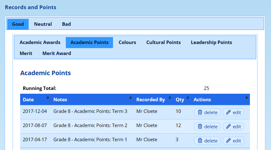 These now behave in exactly the same way as other Records and Points that a pupil might accumulate. If, for example, you need to correct an error in a pupil’s records, it is as simple as visiting their records and points page and making the change: