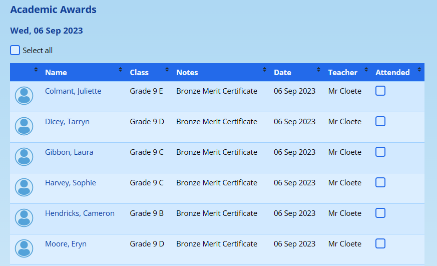With this list, you can tick them off to mark them as having received their award or certificate and this will remove them from the list for next time so that each time you look at this list, it has only the new awards. Regardless, the date that the award was made is shown.