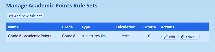 Navigate to Reporting → Academic Points → Maintain rule sets.