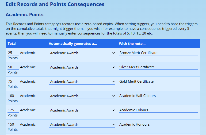 The next common use-case is that these points should lead to consequences. In the example below, these are called “Academic Awards”, but this can be changed to better suit your needs.