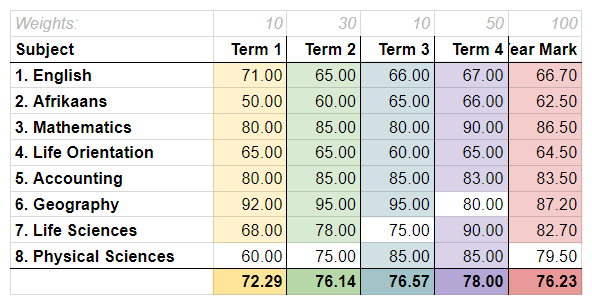 Normally, the final year aggregate will match the result if you were to weight the aggregates for each term (in the example above 72.29, 76.14, 76.57 and 78.00). However, because the final year aggregate does not include Phsyical Science when Term 3 and Term 4 results do, and the final year aggregate includes Life Sciences when Term 3’s aggregate does not, and the final year aggregate includes Geography when Term 4’s aggregate does not, the weighted averages are not equivalent.