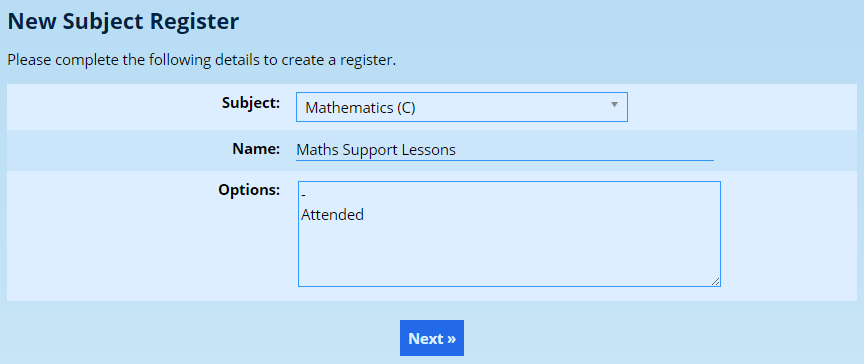 On occasion, it may be desirable to create a single register for an entire subject. This might be for a support lesson where any pupil who takes that subject might elect to attend a voluntary session.