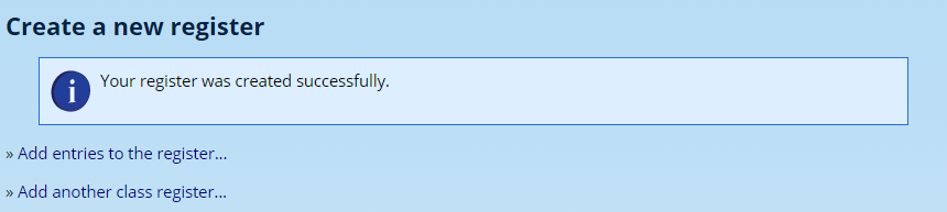 ADAM give shortcut options to either record your first register entries, or to create another register for a different class.