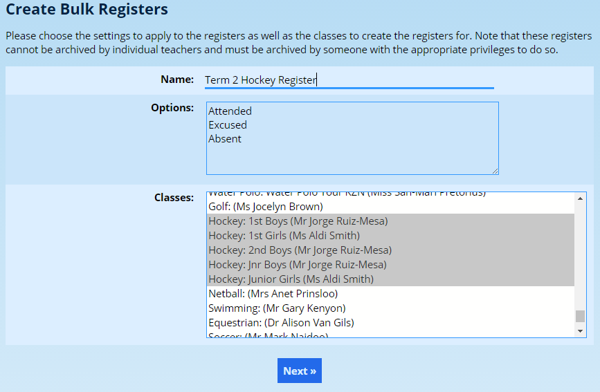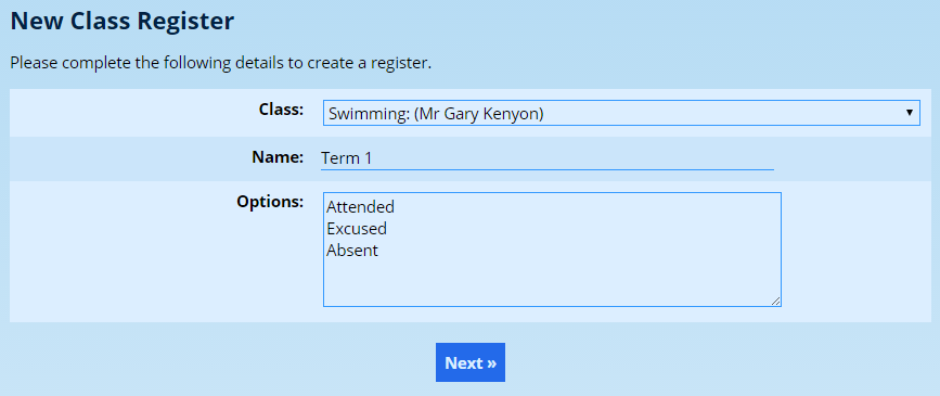Choose the class of pupils that should be included in the register and give the register a name.