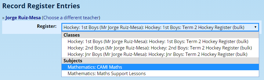 Notice how the class registers are separated from the subject registers. Also note that the registers that were created as part of a bulk operation are listed as such in the dropdown list.