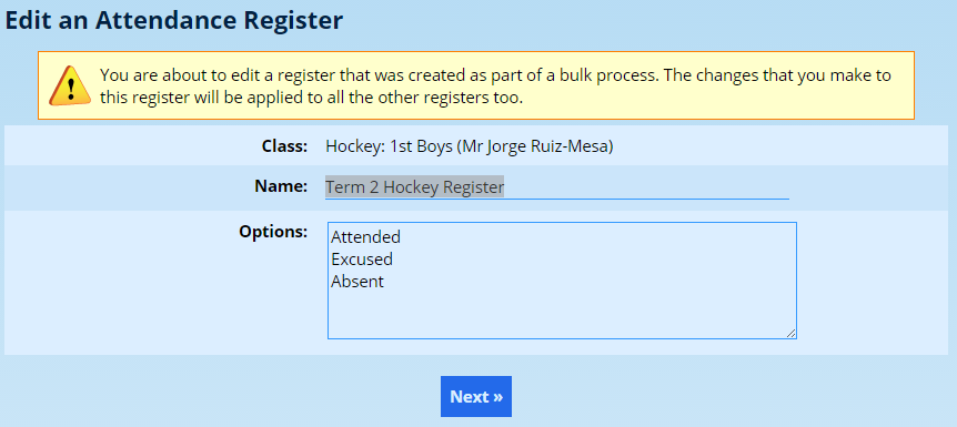 If you wish to change the name or options of a register, click on the Edit register option under the Attendance Registers heading on the Classes tab.