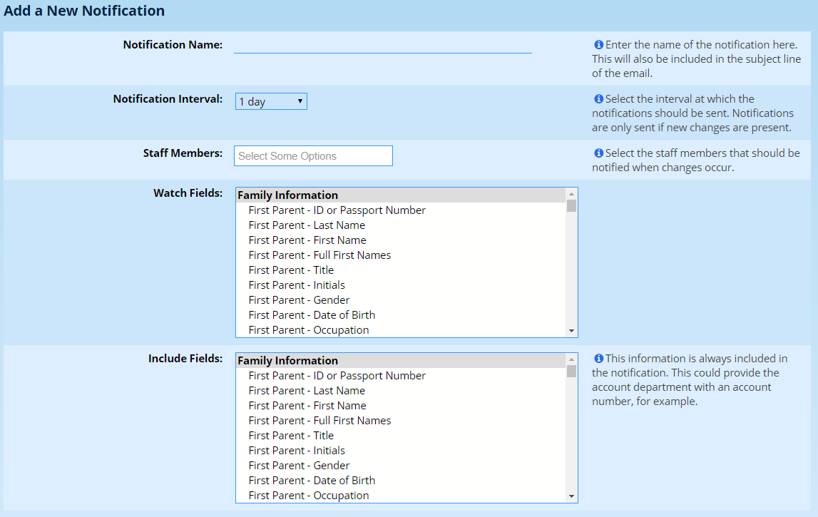 Please don’t mix field types here. Either choose all family, all pupil or all staff. Set up multiple notifications if you need to.