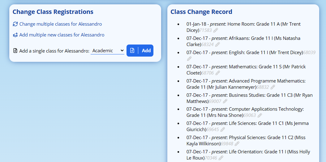 At the bottom of the page are options to change multiple classes or enroll the pupil in multiple classes. This will show all the academic subjects available and classes in that grade.
