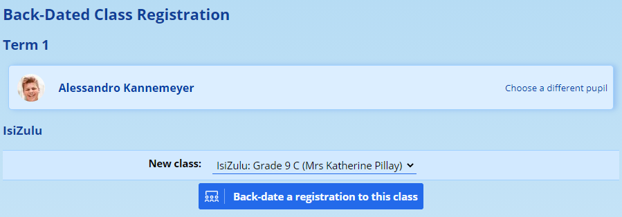 Please note that this method is only intended to be used within a single academic year and that changing a pupil’s registration from one year to another may have deleterious effects! This is particularly true when the classes are associated with a specific grade.