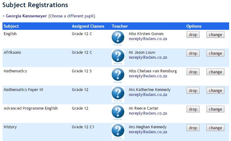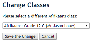 Next to each subject is an option to drop the subject altogether or to change classes within the same subject. The distinction is important here. Dropping will remove any marks from open Reporting Periods whereas changing will transfer marks from one class to another.