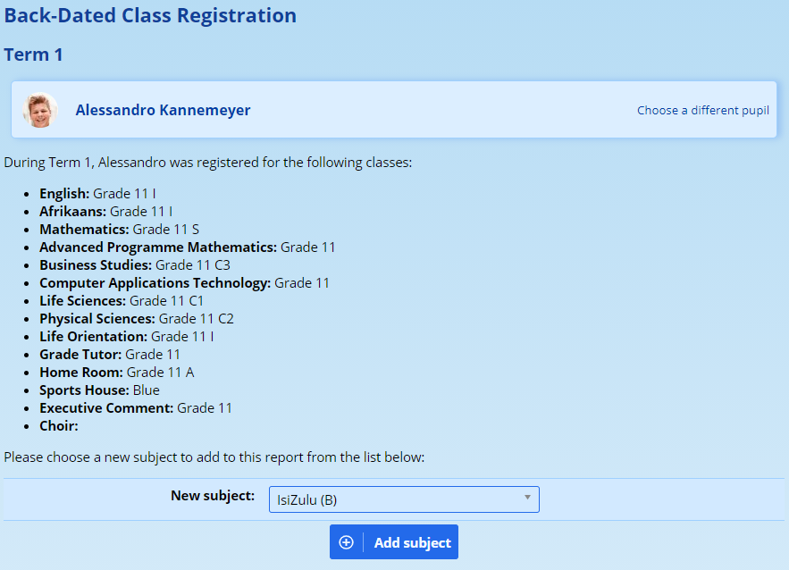 ADAM will then show a list of classes that the pupil was registered for when the selected reporting period ended. Choose a new subject from the list at the bottom and click on Add Subject.