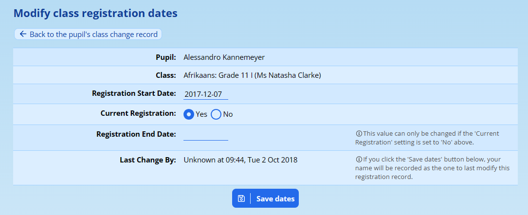 Changing the Registration Dates for a Pupil