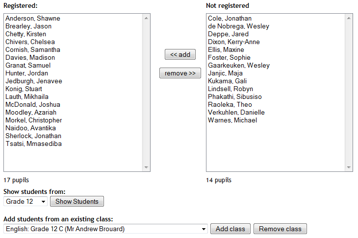 Highlight the names on the right (you can hold down “Ctrl” and click on names in order to select more than one at a time) and then click on “<< add” to have those names added to the class list. Similarly, pupils can be removed from the class by selecting names on the left and clicking on “remove >>”.