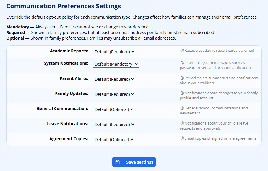 - Mandatory: The parent may not opt out of these messages. All email addresses must receive this communication. This is only useful for very urgent and important emails and, by default only includes System Notifications. This is typically communication such as Password resets that is initiated by an action taken by the parent.