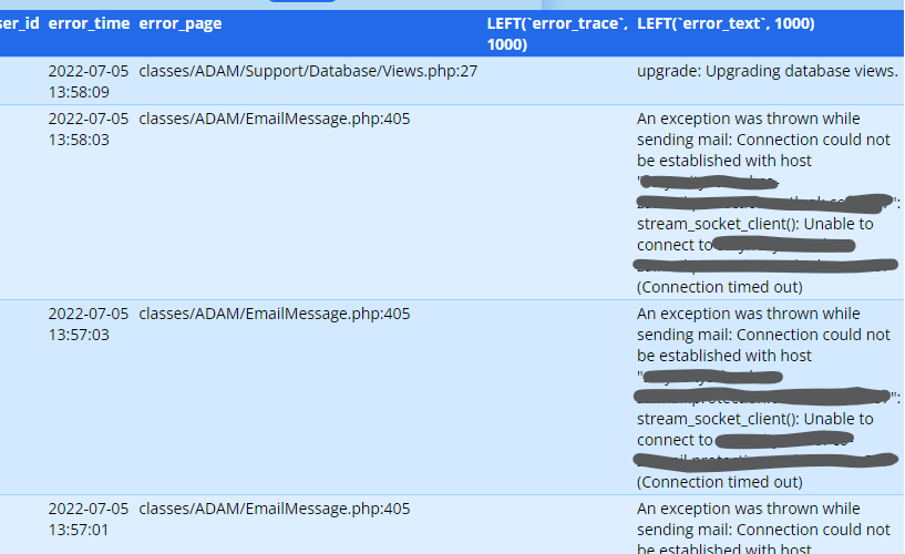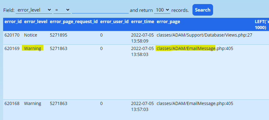 In the log, within the first few rows, you may see one or more “Warnings” that are associated with the page “classes/ADAM/EmailMessage”: