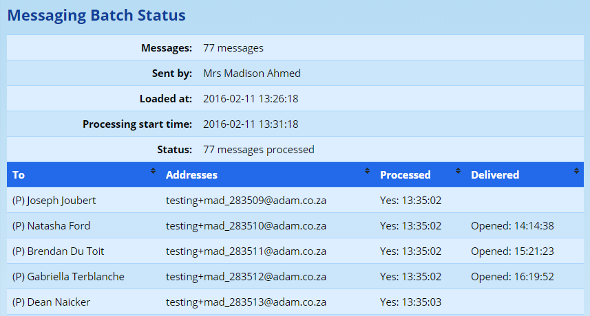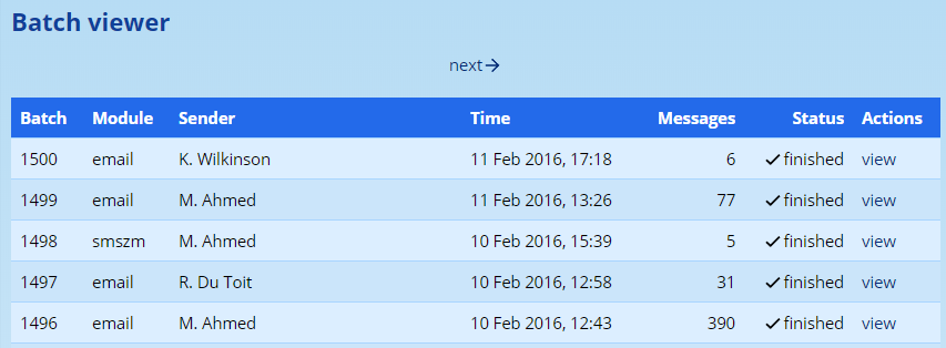 The first thing for a site administrator to do is to check the messaging batch records. These can be found Administration → Messaging Administration → View Messaging Centre Batches.