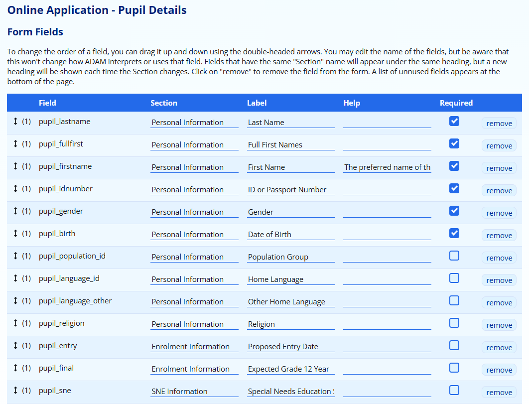 For each field, ADAM shows the internal field name, a Section header, a Label, Help and whether the field is required or not. You can also drag the icon in order to change the ordering of the fields, and click on the remove button to remove the field from the form.