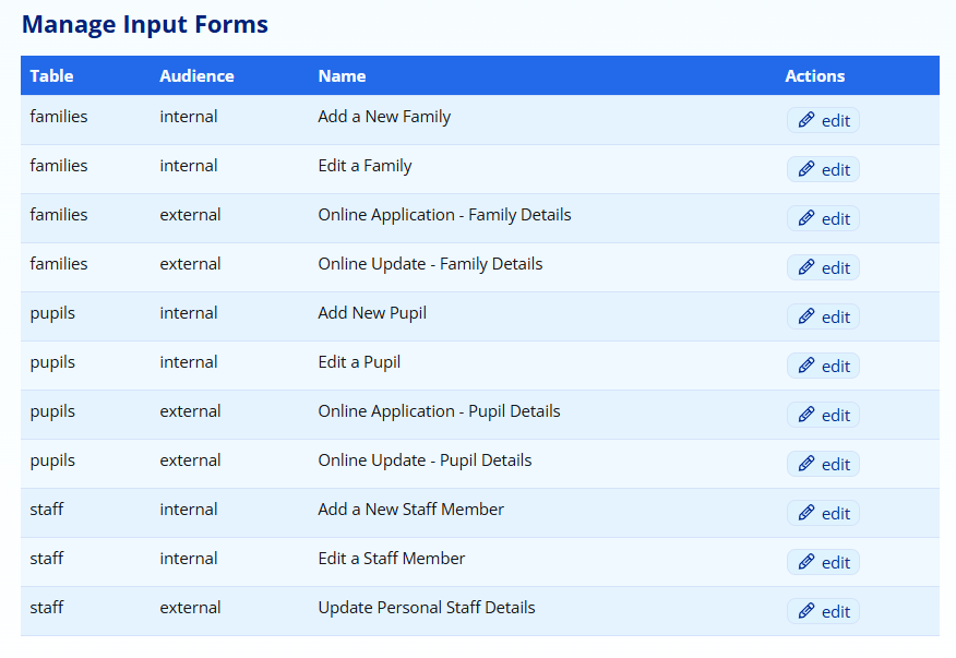 Each form has an audience (internal vs external) which tells you whether the action is going to be performed by a staff member (which would be considered internal) or a parent (which would be considered external).