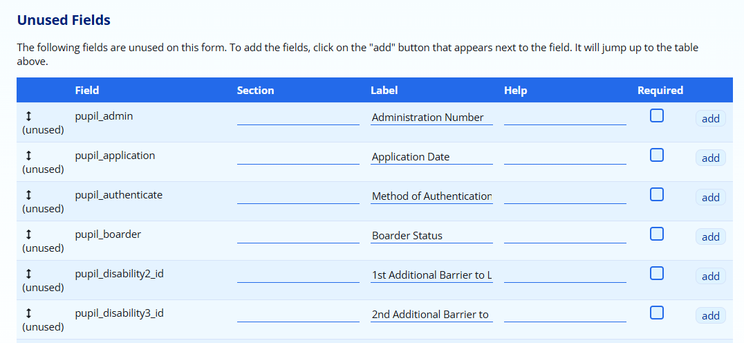 While the fields in ADAM are reasonably standard, there might be reason for a school to want to edit the headings and order of the fields. Some schools may choose not to use certain fields and would like to streamline the interface so that only the necessary fields appear.