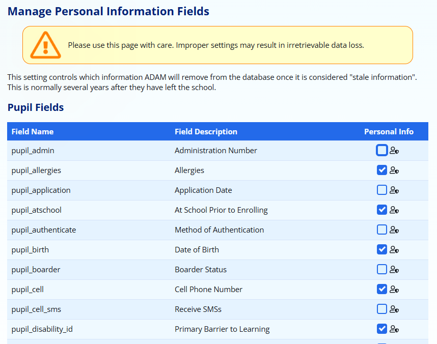 You can manage personal information for Pupils, Staff and Families. Note carefully that this setting is used to ensure that these fields are erased when the information is no longer relevant. This should include, as examples, medical information and contact information. However, you should not set fields such as Names here since they will be erased and you will have unidentifiable information stored in your database. This is problematic from an archival perspective since if you are requested for historical educational records, you won’t have a way to access it.