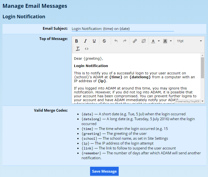 Unlike other message templates, this one does not provide a “rich” text editor and, instead, provides the raw HTML that is used to format every message - including the other templates that ADAM lists.