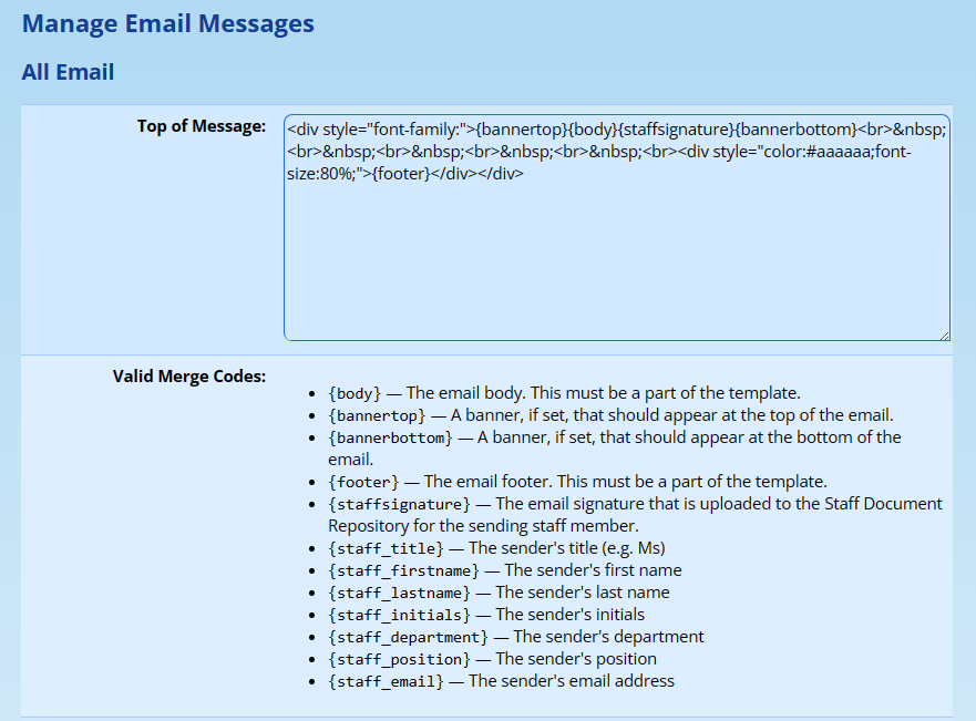 - Valid Merge Codes: Each email template provides different merge codes. These merge codes can be used in any of the sections. They must appear exactly as shown with the braces “{}”.