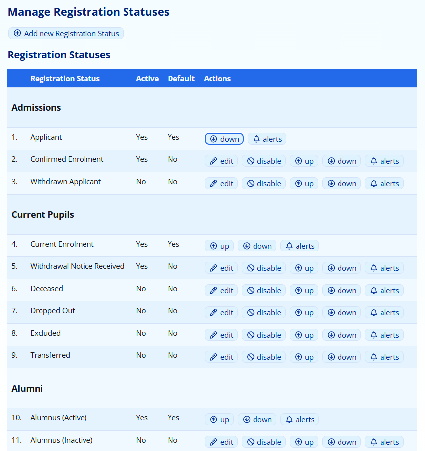 Next to each option in the “Manage Registration Statuses” page (except for the default statuses), it is possible to disable the registration statuses. This will not delete them or have any effect on people who are currently assigned to that status, but no further pupils will be able to be assigned to that status.