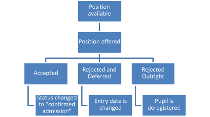 When a space becomes available in the school, the list of “Current applicants” is searched to find a suitable pupil (based on the school’s admissions criteria) to fill that place. The parents are then contacted to follow up. One of three outcomes is possible: