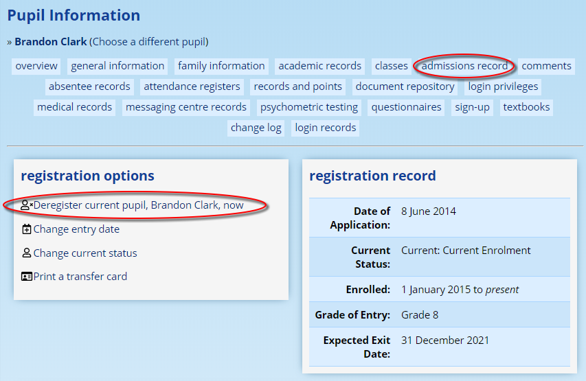Pupils can be deregistered either from their information page, on the admissions record tab.