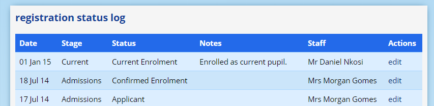 At the bottom of the Admissions Records within the Pupil Information is a registration log. This can be edited by users with the necessary permissions. This is allowed to correct comments or statuses.