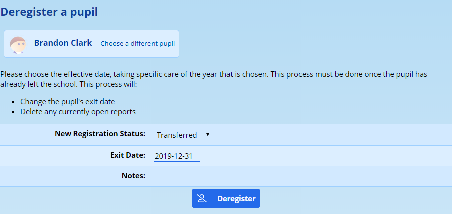 Deregistering a pupil moves them from an active to an inactive state on the system. While they will still appear in searches for them, they are not available for selection anywhere else on the system. The deregistration process does a number of other behind-the-scenes operations, including the removal of a pupil from all their classes and a number of other tidying operations.