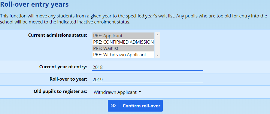 Navigate to Admissions → Enrolment Administration → Manage admissions. On this page, select the option to Roll over entry years.