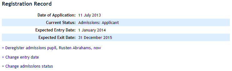 Occasionally it is necessary to change a pupil’s date of entry. This can be done using the option on the “Admissions” tab under the “Enrolment Administration” heading: “Change a pupil’s entry date”.