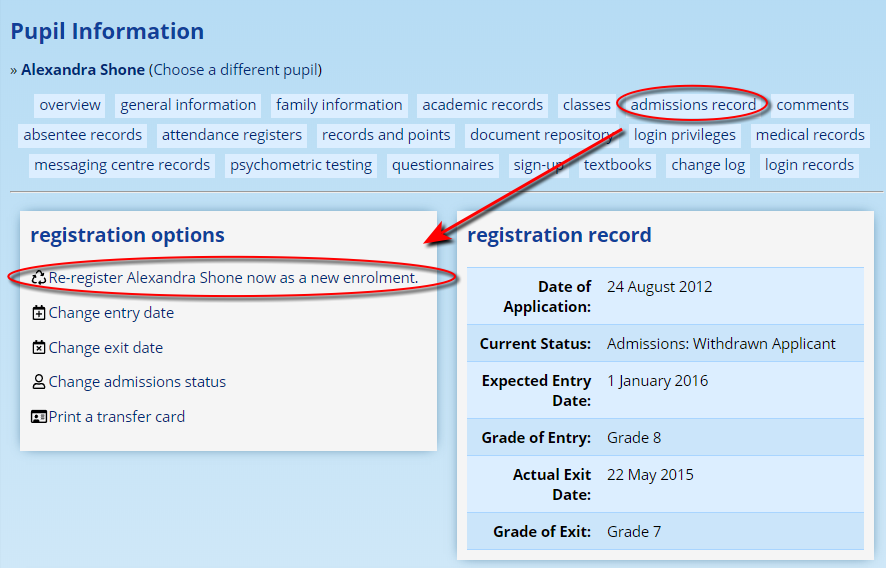 Re-registering pupils individually (Admissions, Current and Alumni)