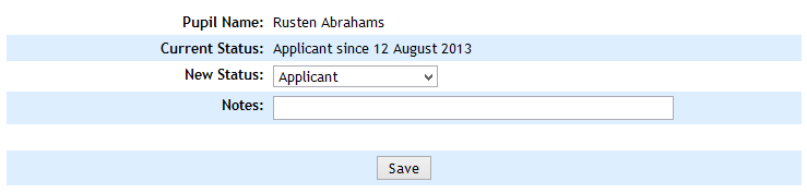You will only be able to choose the same type of registration status. For example, if the pupil is currently an active admission, you will only be able to choose other “active admission” statuses. To change the pupil to an inactive status, you must “Deregister” the pupil. See later in this section for deregistering pupils.