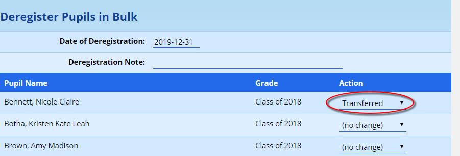 At the top of the screen you can set a deregistration date and add a note. These details will apply to all pupils you select below.