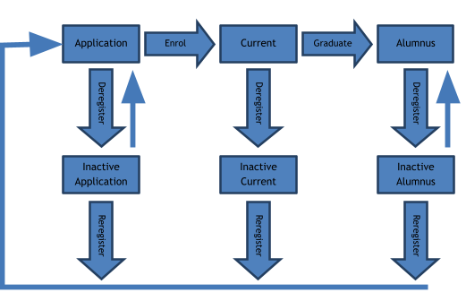 It is possible, in the case of Applicants and Alumni to move between active and inactive statuses using feature provided on the “Admissions” tab under the “Enrolment Administration” heading: “Manage admissions”. On this page are two options: one is to manage the registration statuses of admissions pupils and the other is to manage the registration statuses of alumni. It is possible, here, to simply change the statuses as one chooses.