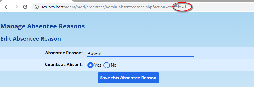 Navigate to Administration → Absentee Administration → Edit the absentee reasons. Click on the edit option next to each and notice the address bar end with the text &id=.... The digits that are shown there represent the id number of the reason. This is illustrated below, where the reason_id value is set to 1.
