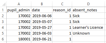 - date: the date of the pupil’s absence. This should be given in ISO format: “YYYY-MM-DD”