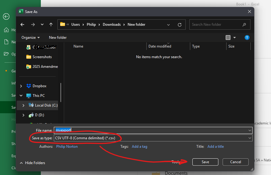 When you save the file, use the “Save As” option and change the type to “CSV”: