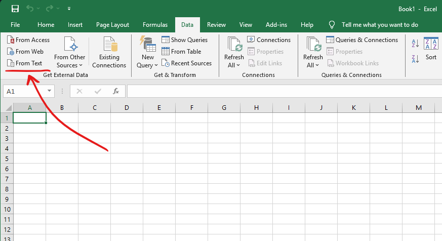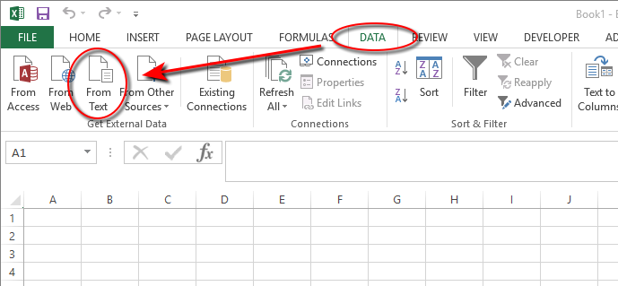 - On the DATA tab of the ribbon, look for the “Get External Data” section and click on the “From Text”: