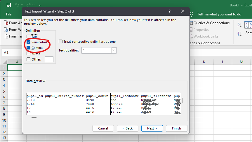 Now specify the delimeters are either semicolons or commas (you can select both options, just in case):