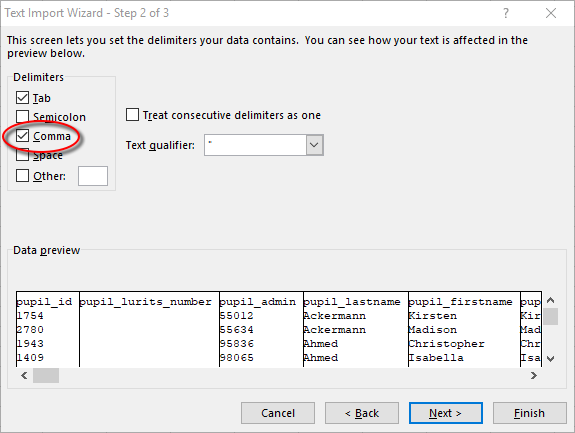 - Choose the appropriate delimeter. It will most likely be “Comma”, but could also be “Semicolon”, depending on the settings you chose when you exported the data: