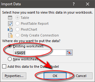 - Once you’ve applied this formatting to all the columns, click on “Finish”. ADAM will ask you where you’d like to add the data. Excel should offer to add it in at “A1” in the current worksheet. You can click on “A1” if Excel suggests elsewhere. Click on “OK”.