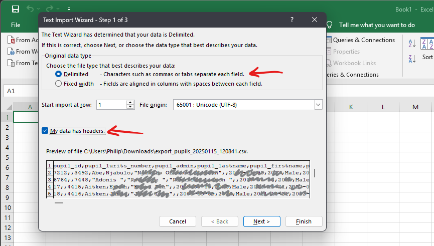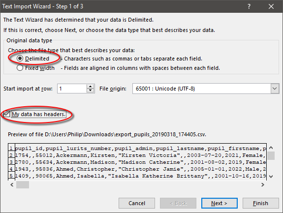 Tell Excel that your information is Delimited (this is normally selected by default) and that “My data has headers”.