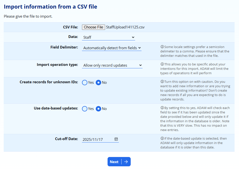 Click on the Choose file button and select your CSV file from the file selection window. You must tell ADAM what sort of Data you are going to import. ADAM will use this information to double check that your CSV file is properly structures, so it is very important that you get this right.
