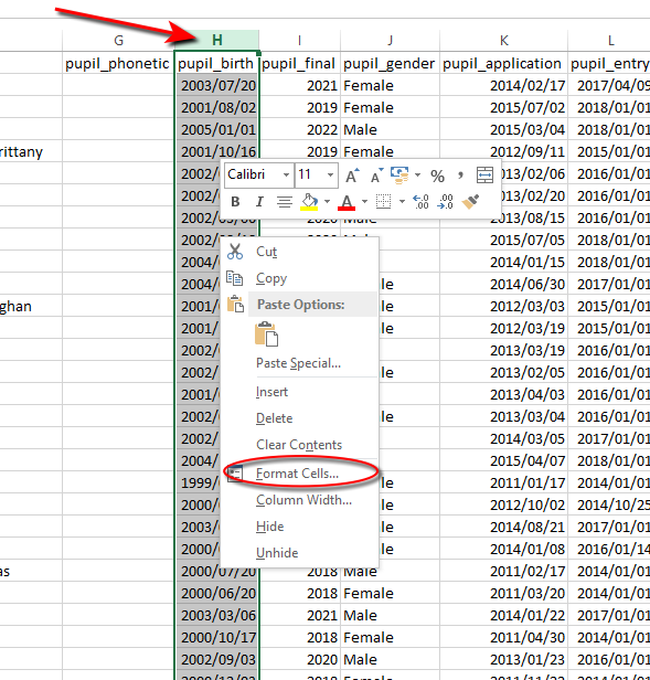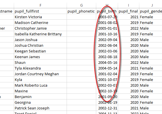 - pupil_birth: This is the date that the pupil was born on. It should ideally be entered using the standard ISO formatting: “yyyy-mm-dd”. This field is required.